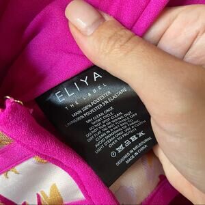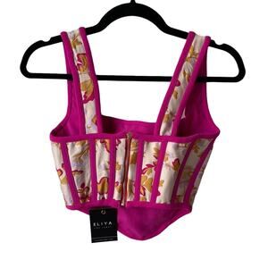 Eliya the Label Yasmina Corset Top and Rio Cut Out Pants. Features floral jacquard, structured bodice, scoop neckline, contrasting fuchsia boning channels. satin lining, centre back metal zipper. 96% polyester 4% spandex. New with tags.