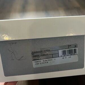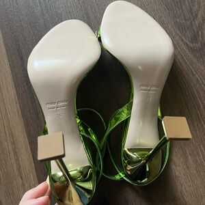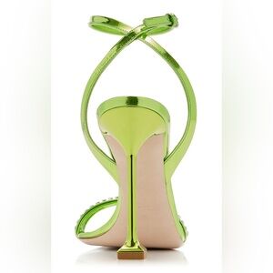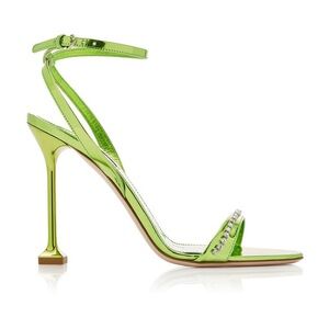 Brand new in box, does not come with receipt. Poshmark authenticates purchases $500+. "Made from glossy metallic leather, these sandals have a barely there silhouette with crystals lining the toe strap and a sculptural pyramid heel. Wear with equally glam looks, from gowns to sparkling mini dresses."