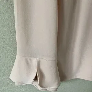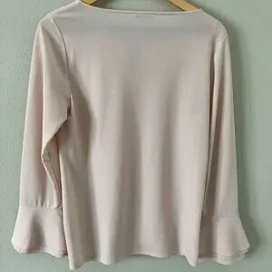 Calvin Klein medium silky (95% polyester 5% spandex) blouse. Color is blush - palest pink. Long-sleeve with feminine petal-like sleeves. Blouse is slightly tapered and very flattering. It was only worn a few times, so in good condition. Only one tiny 1/4" snag on backside of sleeve near elbow - see photo). Medium for Calvin Klein is size 8-10. Blouse is very versatile - could be worn with suit, skirt or even jeans.