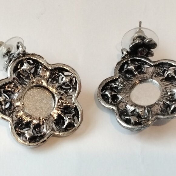 How pretty are these dangle-style earrings with amber/burnt orange glass on embossed silver metal bases? The metal has tiny scrolls in it. They are for pierced ears and are in excellent pre-owned condition. The length of each is 1 5/8 inches and the width is 1 inch. The closures are push back.