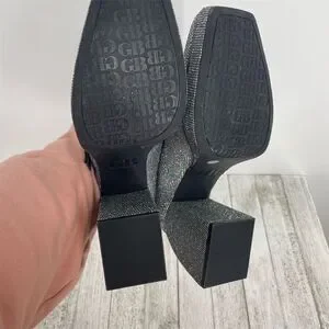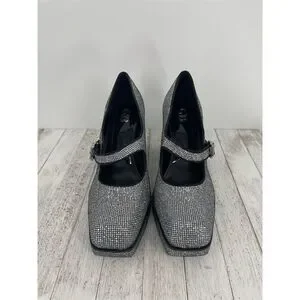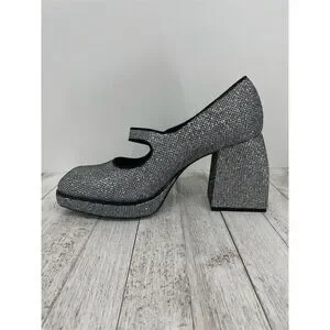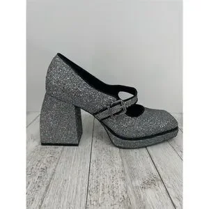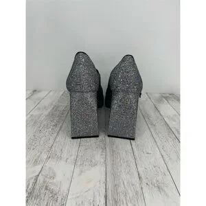 The Gianni Bini platform heels in size 10M feature a high block heel and closed toe design, crafted from synthetic materials. The silver color and rhinestone embellishments create a sparkly disco ball effect, making them ideal for party or cocktail occasions, especially in the fall season. The shoes have a buckle closure for a secure fit. Pre-owned in like new condition.
