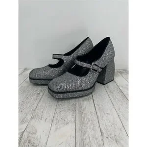 Keywords: Gianni Bini, platform heels, silver heels, women's shoes, party shoes, cocktail shoes, rhinestone heels, block heel, closed toe, fall fashion, pre-owned shoes, size 10M, synthetic material, buckle closure, sparkly shoes.