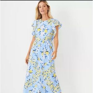 Ann Taylor Tall Ruffle Sleeve Lemon Dotted Swiss Blue Midi Dress Size M