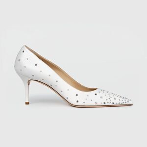 Make a bold statement with these chic white leather pumps featuring a 75mm heel. Perfect for special occasions or everyday elegance, one shoe dazzles with a sparkling "Love Wins" design, while the other keeps it timeless and sleek.