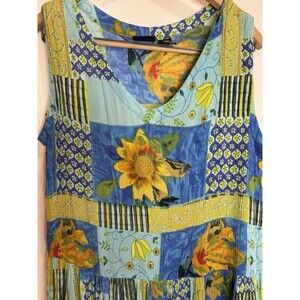 This is a vintage Bila California maxi dress for women in size Medium. It features a patchwork design with a blue sunflower pattern. The dress is sleeveless with a V-neckline and a pullover closure. Made of rayon fabric, this long dress has a boho 90s style, making it suitable for various occasions like travel, weddings, parties, casual wear, or work. Perfect for summer, fall, and spring seasons. Dresses in excellent preowned condition with no obvious flaws holes or stains. No vintage smells. Clean and freshly laundered steamed sanitized and bagged. Measurements are in photos. I appreciate your business and strive for a five star rating. Please feel free to message me with questions.