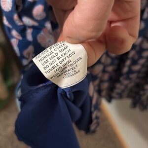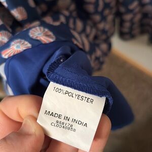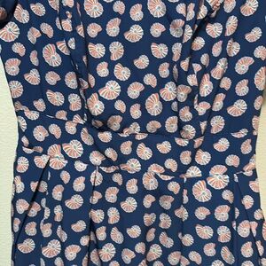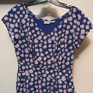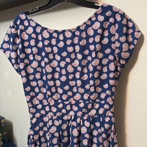 Comes from a smoke free home. Side zipper, banded waist. Material is not stretchy. Has pockets. Dress is lined. Length 38, bust 18, waist 14 hip 23. NWOT. No damage. Color is dark blue with orange and white ammonite fossil print.