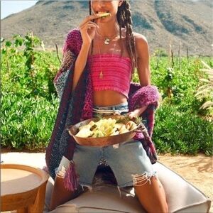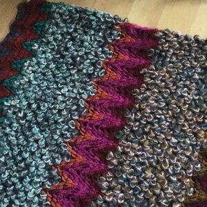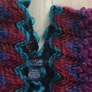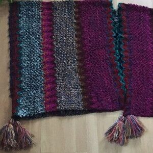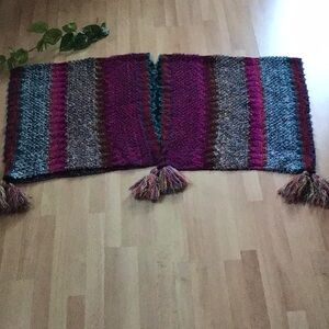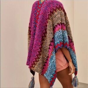 # one size rare sold out hard to find ooak Anthropologie Free People Sundance Italy knit crochet hand knit look handcrafted style sweater poncho wrap scarf shawl cape colorful multicolored multicolor red magenta fuchsia pink purple violet teal turquoise blue green tan beige cozy winter fall vegan fabric acrylic cottagecore grannycore grandmacore boho bohemian zigzag wavy pattern print stripes striped stripe tassel tassels fringe western southwestern
