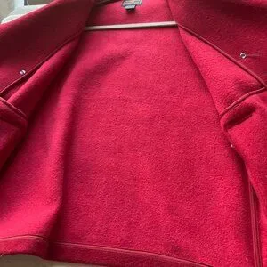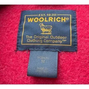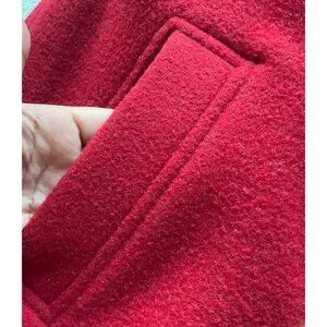 Woolrich womens Sz Medium Pea coat wool blend Ruby Red Double breasted , material 84 % wool and Nylon, color Ruby Red, very good used condition just buttons are a bit loose and one button has a light scratch (easy fix)and light wear see photos 7 and 8, front pockets, inside fleece, not lined , short length