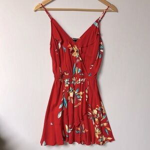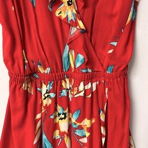 Super cute, faux-wrap sun dress trimmed with ruffles, in a red/tropical floral print. Hook and eye closure at bust, adjustable spaghetti straps, elastic waistband. Very flattering and so fun to wear. Worn 1-2 times, many compliments.
