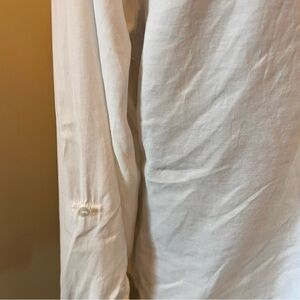 This is a like new white button front top from Chicos in size 2 or med. No stains or rips. The sleeves can be worn long or rolled up and buttoned. Two front pockets. Measures 26” long and 22” across the bust. I am also including a lovely white beaded necklace that has 10 strands of various white beads to match any outfit.