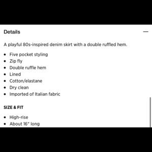 Alice + Olivia ruffle hem denim mini skirt. High waisted. Sold out at Saks, Bloomingdales and Bergdorf Goodman. Retail price is $265. Color is called She Has It All.