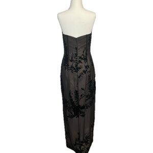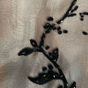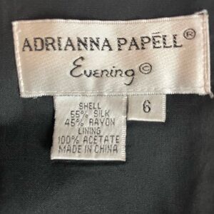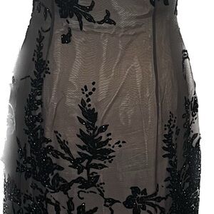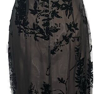 Adrianna Papell Evening Gown, Black, Sheer, Velvet, Bead Detail, Nude Slip Insert, Zipper Closure, Size “6”. Worn once. Small hole from stepping in gown with heel. Small heel tear was repaired. See photo. Hem stitching came loose. Originally paid $250. Selling 90% off, as is, for $25!!