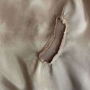 @khayes7 The small hole was patched/stiched and is approx. 3" x 1". The repair is very difficult to see from the outside of dress, but is visible in the inside lining of the dress. I suppose if it is windy outside, the dress may flip up from the side slit and could potentially show the the small repair. The dress has been significantly reduced because of the repair and the loose hem stiching. A semstress could possibly shorten the dress mid or above the knees, and remove the stiched repair.