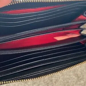 Please see last picture of red staining to the back.I believe the wallet was sat on something red and was stained. Inside is in Perfect condition. Smoke free home
