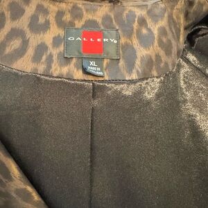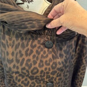 All weather trenchcoat in a size extra large. Black buttons and a brown and black leopard print with a dark brown silk lining. Really unique collar almost looks like a scarf and you can shape it in different ways, very beautiful and elegant.