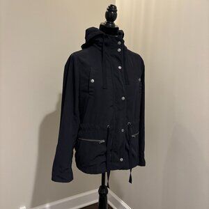 Classic navy blue raincoat from Forever 21 in size Medium. Hooded, zips closed under buttons, with lots of pockets & a drawstring waist. Excellent used condition - no stains, rips/tears, or visible flaws.