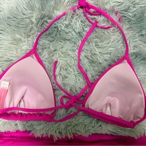 💕 Stylish bikini set. Triangle top with adjustable ties. Comfortable fit. Bottoms are classic hipster and have tags attached. The liner is still in the bottoms & they haven't ever even been tried on. Brand new! Bright pink color. The bottoms have a gold band on the top of the back - see photos. Both pieces are size large.