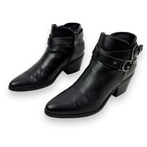 G by GUESS GBG black vegan leather cowgirl ankle boots. Inner zipper to easily put on. Harness around ankle with buckle and Guess logo on sides. Pointed toes. Vegan friendly faux leather. 2.5" heels on a 0.25" platform. Slip proof bottoms. Marked size 8.5 M. Ball width measures 3.5". Boot height measures 7" tall. Excellent condition with light signs of wear.