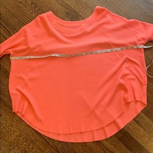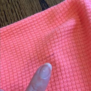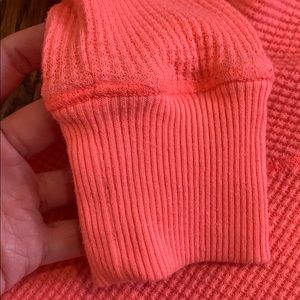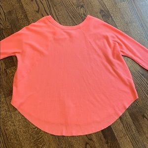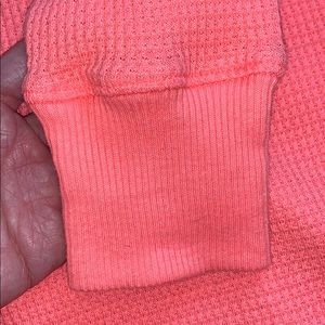 Free People bright orange pink long sleeve shirt. Neon coral waffle Henley. Scalloped unfinished hem (shorter on sides). Loose, comfortable fit. Oversized but fitted through sleeve. 50% cotton 50% polyester. Good condition. Subtle pilling on sleeves and faint stains near shoulder/neckline (pictured).