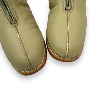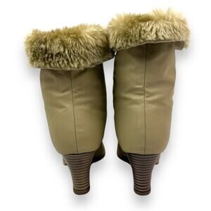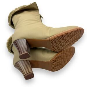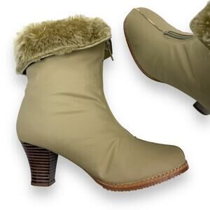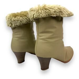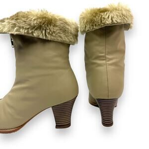 1970's brand new tan winter waterproof faux fur lined boots. Excellent brand new condition, bottoms look completely unworn and brand new! Zipper on front to easily put on. Fuzzy faux fur lined inside. 2.5" faux wood heels on a .25" platform. Almond toe fronts. Top can be rolled down to expose the fur or rolled up. Marked size 6 M. Vegan friendly materials. Boot height measures 9.5" tall.