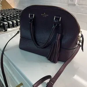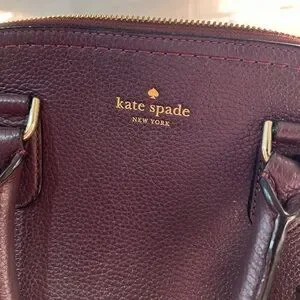 This Kate Spade satchel is a stylish accessory for any occasion. With a domed shape and pebbled finish, it features a mahogany exterior color and gold hardware. The bag has a zip closure and double handles with a 4" drop, making it easy to carry. It also comes with an adjustable and detachable strap with a drop of 21", making it suitable for cross-body wear.