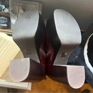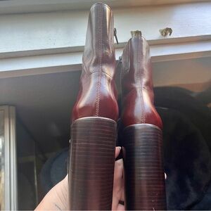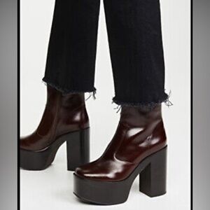 In great condition. Few signs of wear - just a small scratch (as pictured) on back of right boot heel. No major scuffs or damage to boot leather. Chocolate brown leather upper w/rubber sole. Side zipper closure. Gusset detail at collar. Stacked platform and heel. Shaft height: 5 inches. Heel height: 5 inches. Platform height: 1.75 inches.
