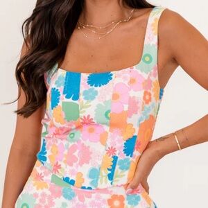 Pink Lily. Top and bottom both size medium. Denim like material but super stretchy. Bottom fit seems to run a little big. Skirt is lined with shorts underneath and has pockets!