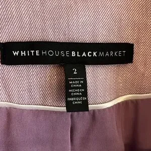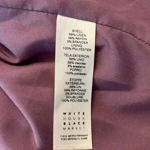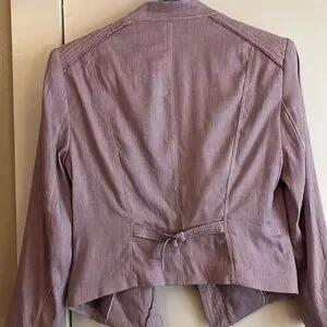 AMAZING WHBM blazer jacket! Lilac purple color open blazer with white stitching details and zipper pockets with the cutest pulls. Soft, quality linen/rayon/spandex blend fabric with a deeper purple poly lining. Has a cute cinching detail at the back with metal buckle. Only callout is the there is a slightly pulled stitch under left arm, but no hole (see last pic). Approx 18.5” PTP