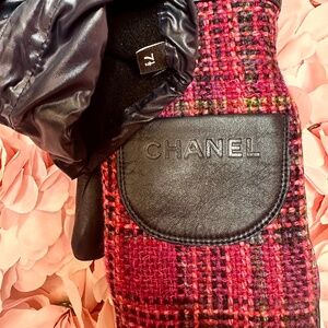 CHANEL Coco Neige Pink Tweed Pink Navy Leather Mittens
