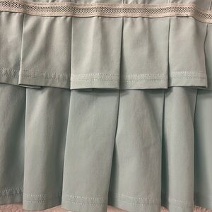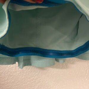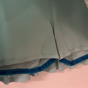 Lululemon aqua mint green pace setter four-way-stretch athletic skirt size 6. Pleaded back with zipper. Shorts have a ball pocket and two hidden pockets on top of skirt. This skirt was loved and well worn.