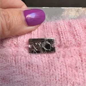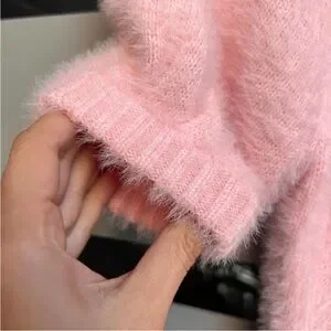carnation pink cropped sweater. 90s-inspired faux mohair fuzzy knit top featuring a U-neckline, fitted puff sleeves and placed tonal rosettes. A medium weight knit. Dry clean only.