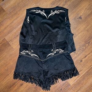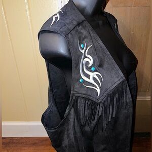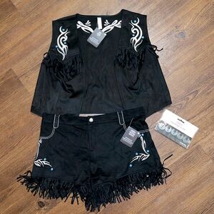 Amscan western cowgirl fringed faux suede black vest with white embroidered stitching and blue rivots