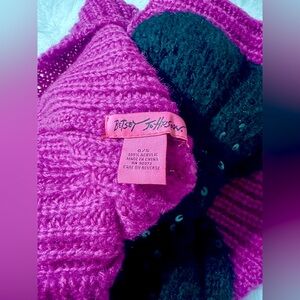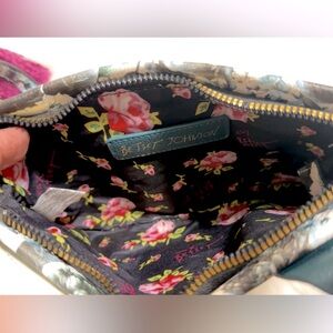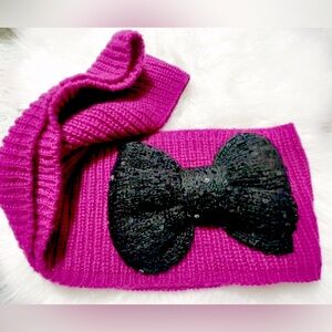 This super cute Betsey Johnson hot pink/ purple wrap scarf has a huge black Bow with sequins. New without tags's. Purchased at Macy's ( it looks dark pink but purple too) beautiful scarf, the crossbody is super cute with removable strap, fits the phone and more, this is white, blue and teal and a little pink on the ears, it has not been used, it has only been stored, it could have a mini scuff on the nose, nothing significant... BID RESPONSIBLY PLEASE!! The crossbody measurements are approximately 8.5” X 6”.