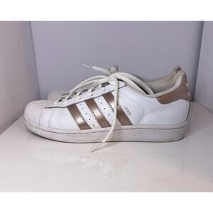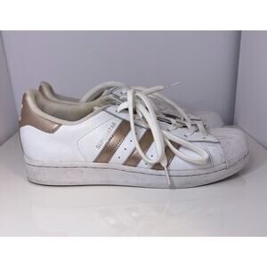 Closet clean out!! Authentic Adidas Superstar White Copper Metallic US Women's Size 7.5. In decent pre-owned condition: there are some dirt stains on the laces (shown in close up photos), the toe cap and midsoles are a bit scuffed, and the collar lining shows signs of wear. Sold without the box. Feel free to message me if you have any questions or to request more photos!