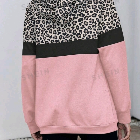 NWT SHEIN LUNE Women Casual Leopard Print Color Contrast Hoodie With Kangaroo Pocket.