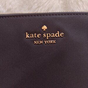 Elevate your style with this Kate Spade Chelsea wristlet pouch. Crafted from durable nylon and adorned with a sophisticated black leather trim, this medium-sized accessory is perfect for any occasion. The solid pattern, classic logo theme, and subtle zipper accents exude elegance and timeless fashion.