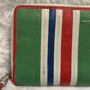 Balenciaga Bazaar green, white, blue and red leather striped long zip around wallet. Preowned with little wear. Please read the whole description and look at all photos. White leather stripes have wear with scratches and peelingg of the white. Could be easily painted. Green has some stains or lines from inside pockets. Corners havw minor wear and rubbing wirh some darkening but no major cracks. White elastic is has small staining but not bad. Leather zipper pull has a little wear with some loose threads and small cracks but no major wear. Inside is all read leather wirh black nylon. Small black marks at top of wallet inside from the zipper rubbing I believe. Small cracks and wear on inside learher zipper pull. Made in Italy. Serial number there.