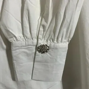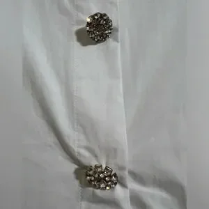 Beautiful, crisp white cotton snap down blouse from Oat New York with embellished snap covers at sleeve and chest. Hi-low hem, collar and split finish (after last snap) allow for versatility (tie knot at waist if desired) and style.