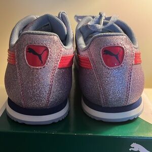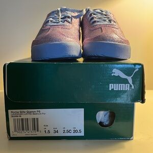 New never worn in the box Puma girl’s glitz sneaker in sparkly lavender with pink patent accent. Size 2.5C