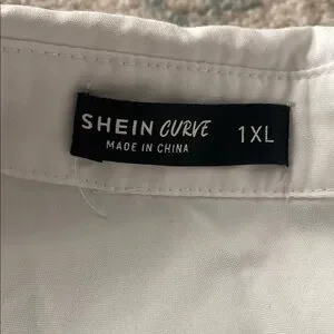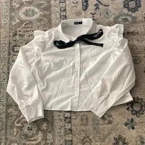 Chic white blouse with ruffled shoulders. Features a stylish black bow tie. Perfect for a classy look.