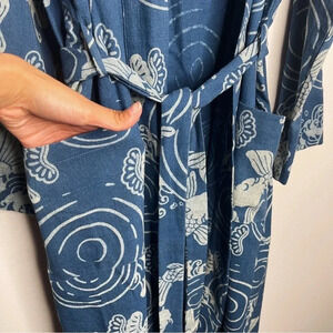 Good condition. Alix of Bohemia First Wave Fish Kimono Long Belted Blue Cardigan Coat. 100% cotton. Size medium.