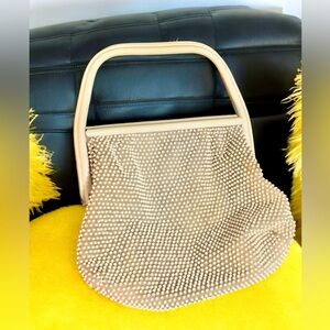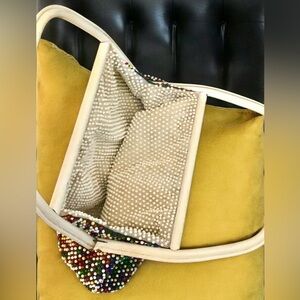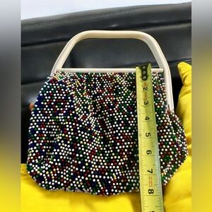 This is a unique purse looking for a special home. This type of of bag was popu in the 1960s and features small beads looking like candy dots in yellow, red, blue, white, green, and red. The lining can be reversed to carry as an ivory or cream purse. The bag is in good condition for its age but does have one missing cream on the cream side of the lining. There are also some scratches on the handle but it still wears nicely. The cream side may have some slight discoloration in some areas. Overall, it’s still a fun colorful way to accessorize an outfit and generate a conversation.