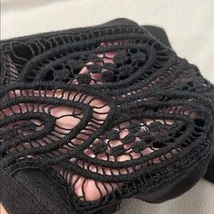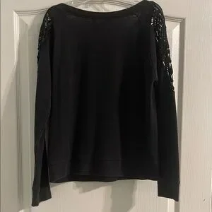 Long-sleeve black tee with stylish lace-knit shoulders. Worn several times so it has some piling but no other flaws. Will discount if bundled with other items.