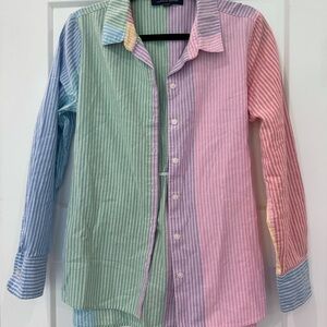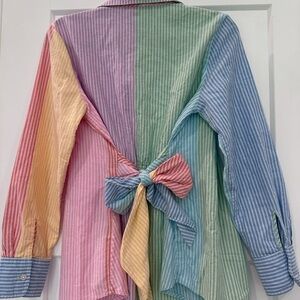 Vibrant striped button up blouse with a large belt/ bow that can be tied in front or back. Perfect for a stylish look.