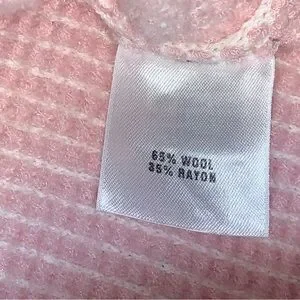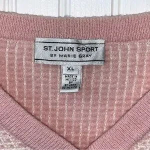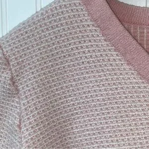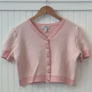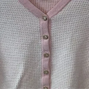 St John Sport Cropped Cardigan Sweater. Light Pink and White. Adorable cropped cardigan, v-neck, full button front with beautiful branded gold and pink buttons, slightly puffed short sleeve, brand patch on left sleeve, wool/rayon blend. Gently used, very good condition, no stains, very minimal wear at right shoulder area from brooch, see all pictures for complete details.