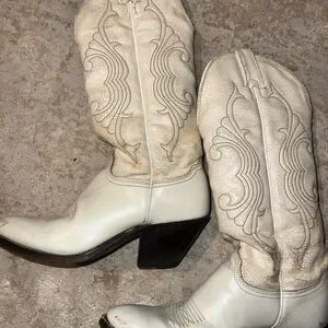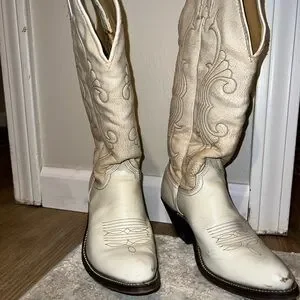 Step out in style with these elegant cream western boots. Perfect for adding a touch of sophistication to any outfit. Some scuffs than can r buffed out, I didn’t have time to clean.