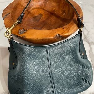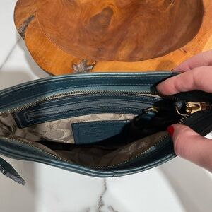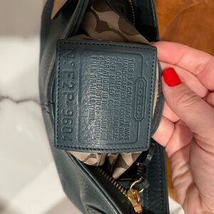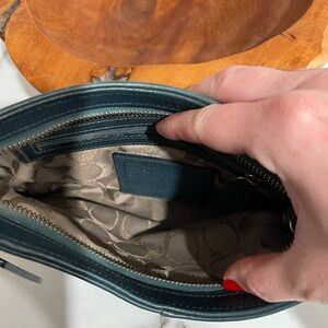 Rare 9604 Green Pebbled Leather Coach with Brass Toggle Dogleash Strap Zip Closure and Exterior Full Slip Pocket Interior Coach Creed Pocket