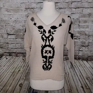Anthropologie Maeve top size XS. Light taupe with black detail. Thin, sheer material. V neck. Bust flat 19", length 24", sleeve length 17" from shoulder seam. Small, faint spot on front shown. No care/material tag. Overall good used condition