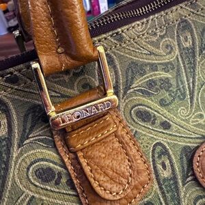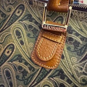 Leonard double handle paisley patterned satchel bag in excellent condition. There is a small lock on the side but I don’t have the key! Top zipper closure. Very clean interior with one interior side zippered pocket. Please see pictures for measurements.