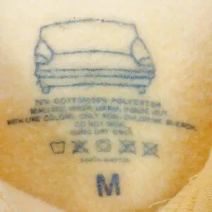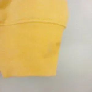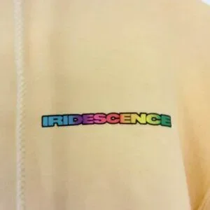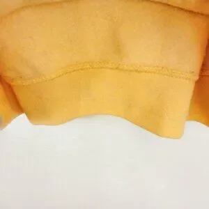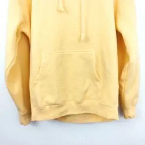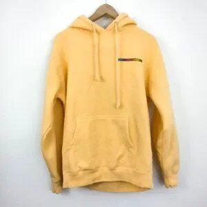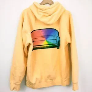 Yellow sweatshirt with rainbow couch logo on the back. Drawstring hood. Fleecy inside lining.